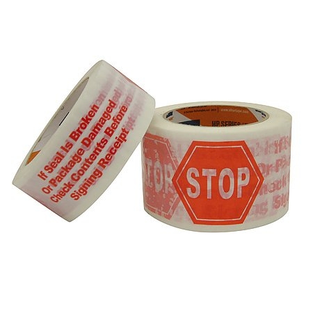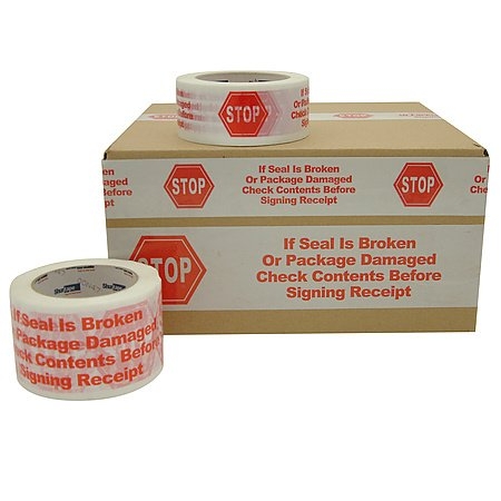 Shurtape HP-240 Production-Grade Printed Message Packaging Tape is a printed stock message tape which allows for quality carton sealing, pilferage proof, and warning messages all in the same application. Same consistent strength and hold as Shurtape HP-200. Use Shurtape HP 240 for medium weight carton sealing; bundling; and repairing cartons, paper and film bags. Full printed message includes red STOP sign along with the text "If Seal Is Broken Or Package Damaged Check Contents Before Signing Receipt." If not otherwise specified widths shown in dropdown are in inches. NOTES: Sizes shipped will typically be the tape industry standard metric-cut sizes, i.e. 24mm for each 1 inch of nominal tape width ordered (rolls are approximately 5% narrower than the nominal size). This product's actual size is 72mm x 100m.