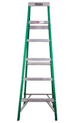 The Ridgid 6'Ft Step Ladder, R2FGS6 in green is a type 2 fiber-glass extension ladder that goes up to 6 feet.