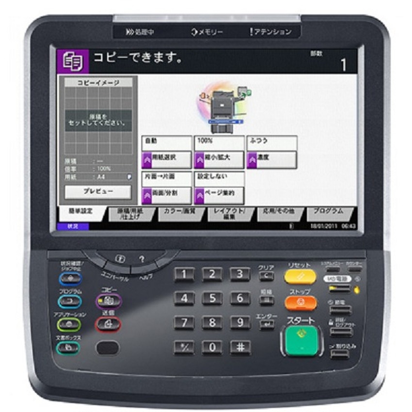 File typePDF (high compressive, encrypted, PDF/A), JPEG, TIFF, XPSOriginal recognitionText, Photo, Text + Photo, optimized for OCRMax. scan sizeA3Scan functionalitiesScan-to-email, Scan-to-FTP, Scan-to-SMB, Scan-to-USB Host, Scan-to-box, Network TWAIN, WSD scanScan resolution600 dpi, 400 dpi, 300 dpi, 200 dpi, 200 x 100 dpi, 200 x 400 dpi, (256 greyscales)Scan speedColour 100 images per minute, b/w 160 image per minute, (A4, 300dpi, Dual Scan)